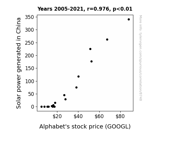 This means 95.3% of the change in the one variable (i.e., Alphabet's stock price (GOOGL)) is predictable based on the change in the other (i.e., Solar power generated in China) over the 17 years from 2005 through 2021.