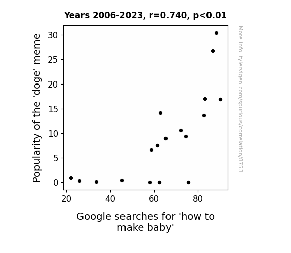 This means 54.8% of the change in the one variable (i.e., Google searches for 'how to make baby') is predictable based on the change in the other (i.e., Popularity of the 'doge' meme) over the 18 years from 2006 through 2023.