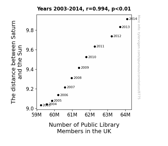This means 98.9% of the change in the one variable (i.e., Number of Public Library Members in the UK) is predictable based on the change in the other (i.e., The distance between Saturn and the Sun) over the 12 years from 2003 through 2014.