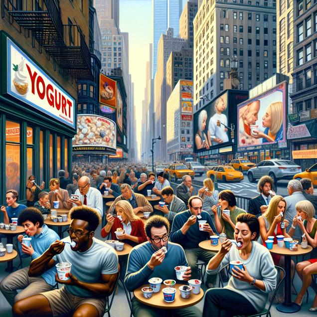 ChatGPT: [ Concept Art ] Generate an image of a bustling New York street, with a focus on individuals enjoying creamy cups of yogurt as they go about their day. Some are sitting at outdoor cafes, savoring the probiotic goodness, while others are seen walking and enjoying the yogurt on the go. The scene should showcase the vibrancy and energy of the city, with the towering buildings and bustling activity in the background. As a subtle detail, include individuals holding calculators and engaged in analytical activities, symbolizing the transformation of some yogurt consumers into actuaries. The artistic focus should capture the surprising link between yogurt consumption and the unexpected surge in demand for actuaries in New York.