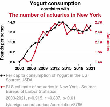 A linear line chart with years as the X-axis and two variables on the Y-axis. The first variable is Yogurt consumption and the second variable is The number of actuaries in New York.  The chart goes from 2003 to 2021, and the two variables track closely in value over that time. Small Image