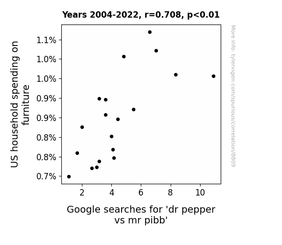 This means 50.2% of the change in the one variable (i.e., Google searches for 'dr pepper vs mr pibb') is predictable based on the change in the other (i.e., US household spending on furniture) over the 19 years from 2004 through 2022.
