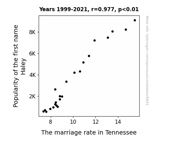 This means 95.4% of the change in the one variable (i.e., The marriage rate in Tennessee) is predictable based on the change in the other (i.e., Popularity of the first name Haley) over the 23 years from 1999 through 2021.
