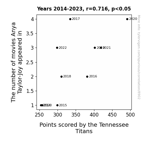 This means 51.3% of the change in the one variable (i.e., Points scored by the Tennessee Titans) is predictable based on the change in the other (i.e., The number of movies Anya Taylor-Joy appeared in) over the 10 years from 2014 through 2023.