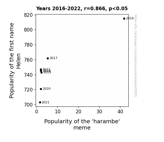 This means 74.9% of the change in the one variable (i.e., Popularity of the 'harambe' meme) is predictable based on the change in the other (i.e., Popularity of the first name Helen) over the 7 years from 2016 through 2022.