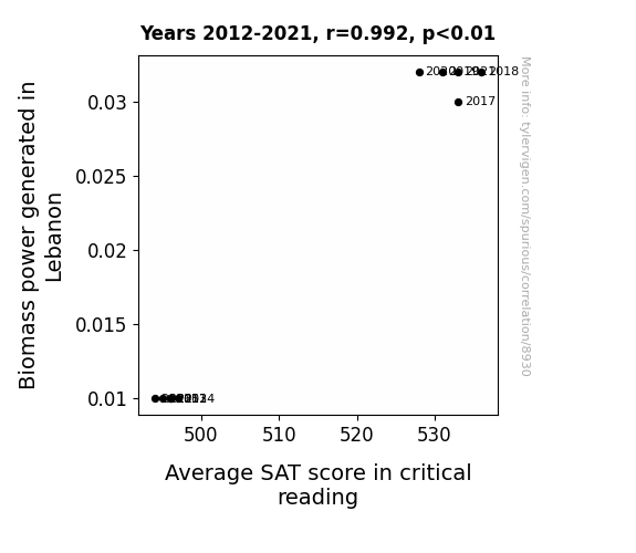 This means 98.4% of the change in the one variable (i.e., Average SAT score in critical reading) is predictable based on the change in the other (i.e., Biomass power generated in Lebanon) over the 10 years from 2012 through 2021.