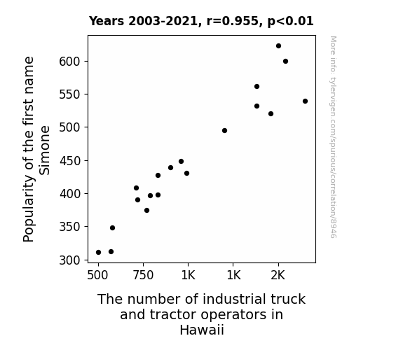 This means 91.2% of the change in the one variable (i.e., The number of industrial truck and tractor operators in Hawaii) is predictable based on the change in the other (i.e., Popularity of the first name Simone) over the 19 years from 2003 through 2021.