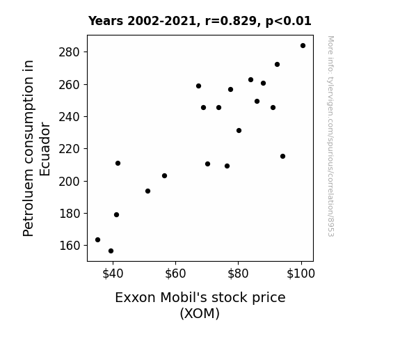 This means 68.7% of the change in the one variable (i.e., Exxon Mobil's stock price (XOM)) is predictable based on the change in the other (i.e., Petroluem consumption in Ecuador) over the 20 years from 2002 through 2021.