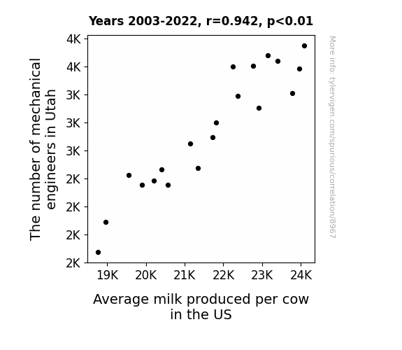 This means 88.8% of the change in the one variable (i.e., Average milk produced per cow in the US) is predictable based on the change in the other (i.e., The number of mechanical engineers in Utah) over the 20 years from 2003 through 2022.