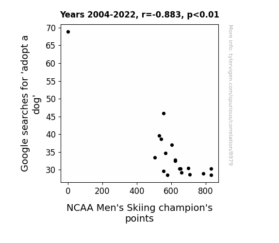 This means 78% of the change in the one variable (i.e., NCAA Men's Skiing champion's points) is predictable based on the change in the other (i.e., Google searches for 'adopt a dog') over the 19 years from 2004 through 2022.