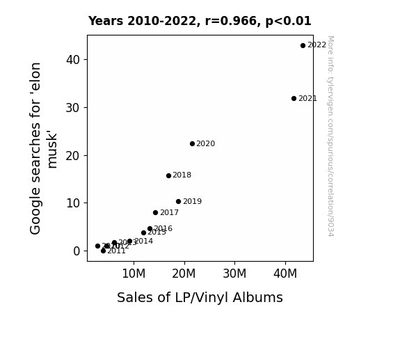 This means 93.3% of the change in the one variable (i.e., Sales of LP/Vinyl Albums) is predictable based on the change in the other (i.e., Google searches for 'elon musk') over the 13 years from 2010 through 2022.