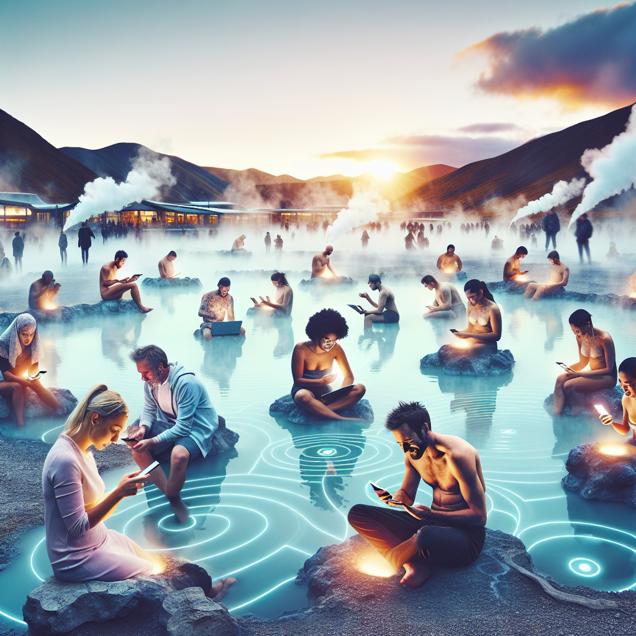 User prompt: Please describe a visual scene that prominently depicts both Geothermal power generated in New Zealand and Number of internet users, in the following situation: As the Earth's crust warmed up from all that geothermal activity, it created the perfect cozy environment for people to snuggle up with their devices and surf the web. It's like the entire country became one big toasty Wi-Fi hotspot, attracting more internet users than ever before. Who knew renewable energy could also fuel our insatiable appetite for cat videos and memes?. Keep the description simple.