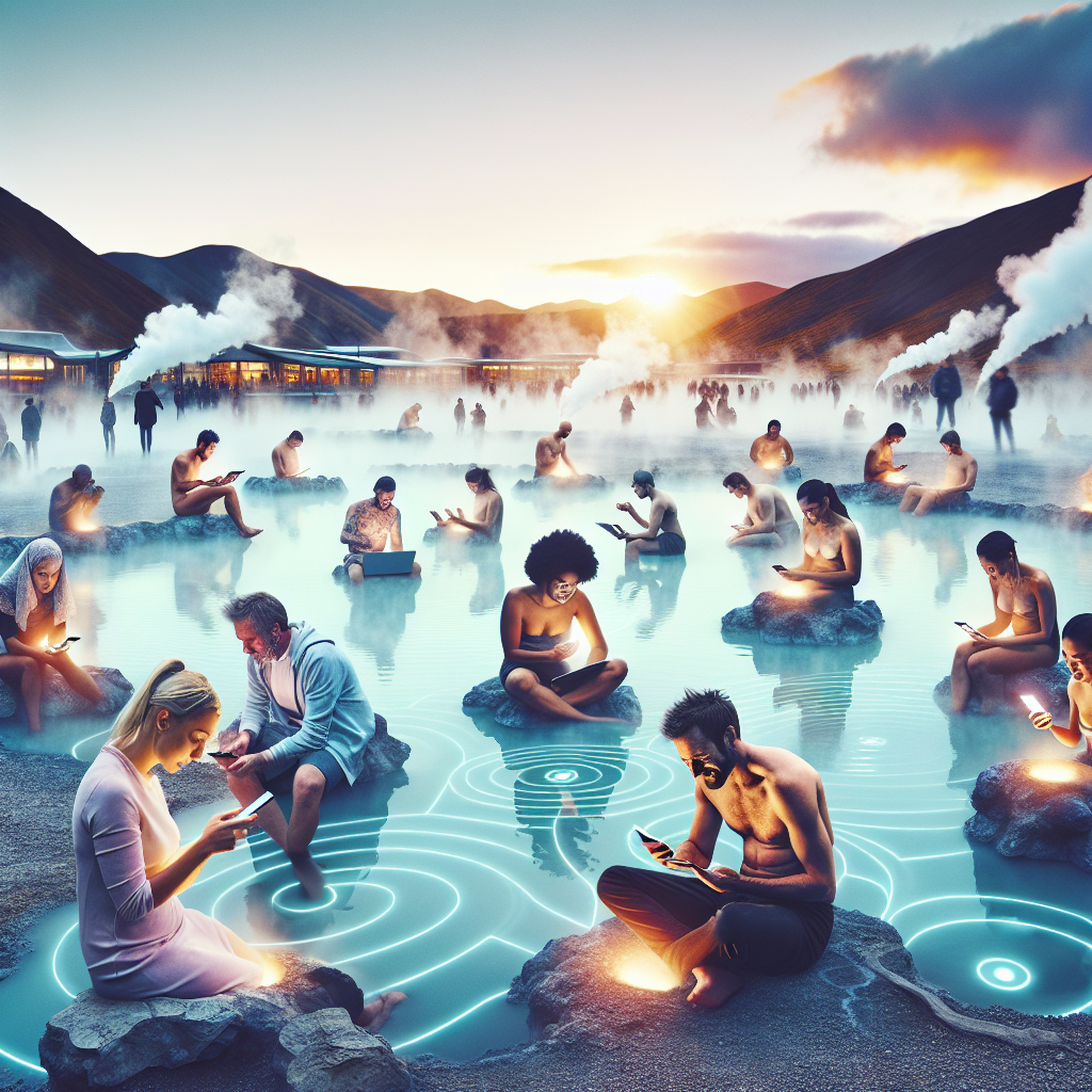 Prompt: Prompt: Generate an image where the landscape of New Zealand's geothermal vents is infused with a futuristic cybernetic art style. Show a group of individuals sitting around the vents, framed by the steam with their smartphones and laptops, meshing the natural warmth with their digital connections. Capture the fusion of nature and technology in a serene, cozy environment. The depiction should include only scenes, people, and objects, it should not include text or speech bubbles.