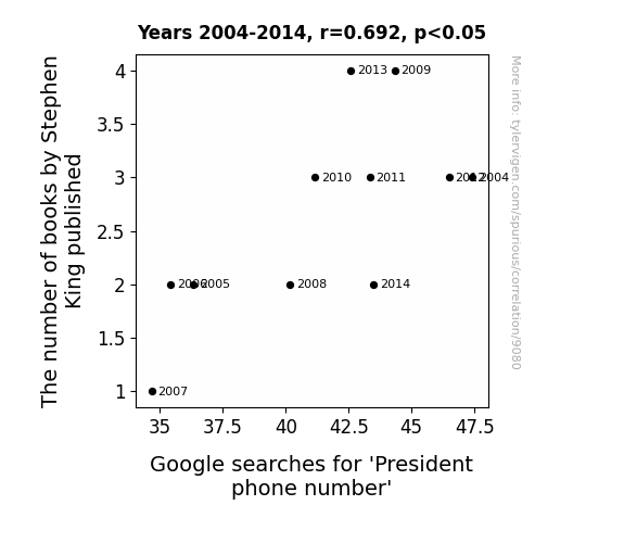 This means 47.8% of the change in the one variable (i.e., Google searches for 'President phone number') is predictable based on the change in the other (i.e., The number of books by Stephen King published) over the 11 years from 2004 through 2014.