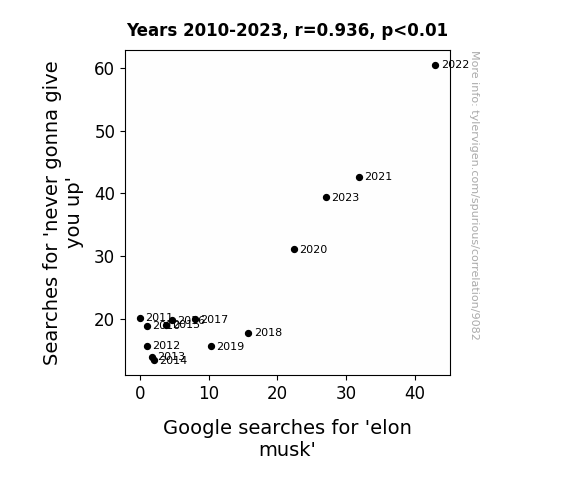 This means 87.6% of the change in the one variable (i.e., Google searches for 'elon musk') is predictable based on the change in the other (i.e., Searches for 'never gonna give you up') over the 14 years from 2010 through 2023.