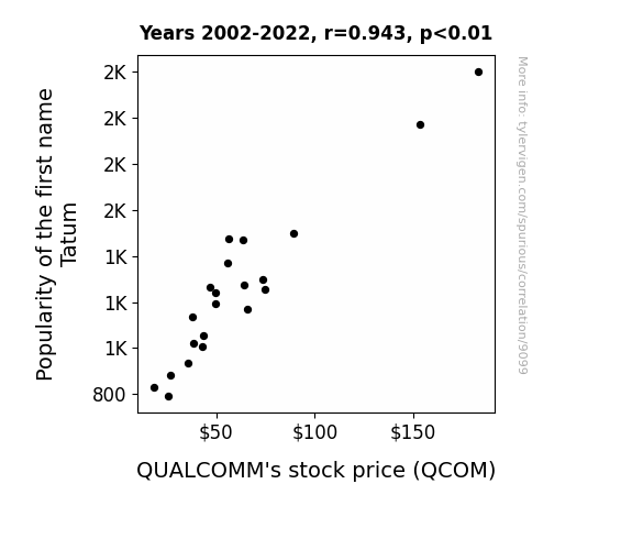 This means 88.9% of the change in the one variable (i.e., QUALCOMM's stock price (QCOM)) is predictable based on the change in the other (i.e., Popularity of the first name Tatum) over the 21 years from 2002 through 2022.