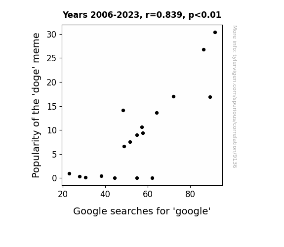 This means 70.3% of the change in the one variable (i.e., Google searches for 'google') is predictable based on the change in the other (i.e., Popularity of the 'doge' meme) over the 18 years from 2006 through 2023.