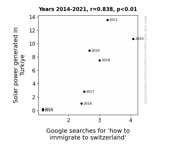 This means 70.2% of the change in the one variable (i.e., Google searches for 'how to immigrate to switzerland') is predictable based on the change in the other (i.e., Solar power generated in Turkiye) over the 8 years from 2014 through 2021.