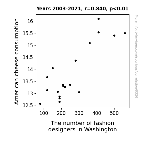 This means 70.6% of the change in the one variable (i.e., The number of fashion designers in Washington) is predictable based on the change in the other (i.e., American cheese consumption) over the 19 years from 2003 through 2021.