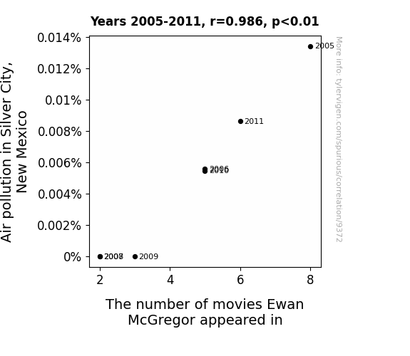This means 97.3% of the change in the one variable (i.e., The number of movies Ewan McGregor appeared in) is predictable based on the change in the other (i.e., Air pollution in Silver City, New Mexico) over the 7 years from 2005 through 2011.