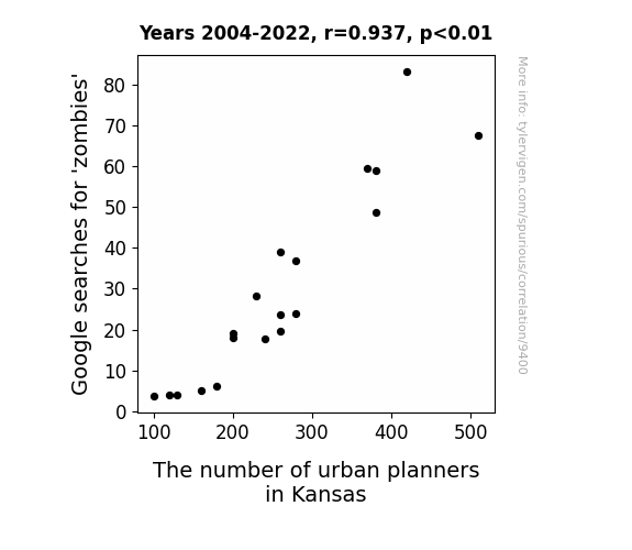 This means 87.7% of the change in the one variable (i.e., The number of urban planners in Kansas) is predictable based on the change in the other (i.e., Google searches for 'zombies') over the 19 years from 2004 through 2022.