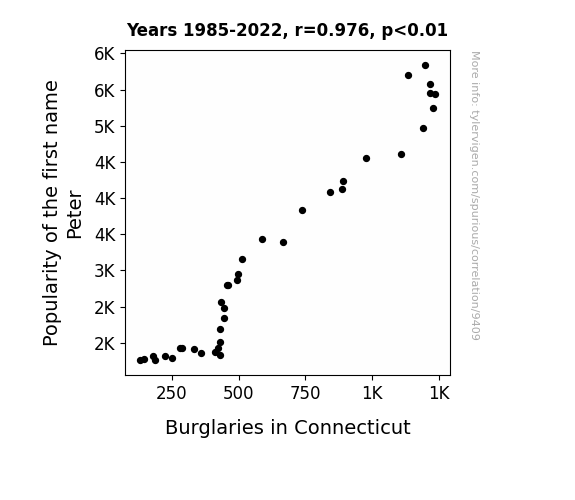 This means 95.3% of the change in the one variable (i.e., Burglaries in Connecticut) is predictable based on the change in the other (i.e., Popularity of the first name Peter) over the 38 years from 1985 through 2022.