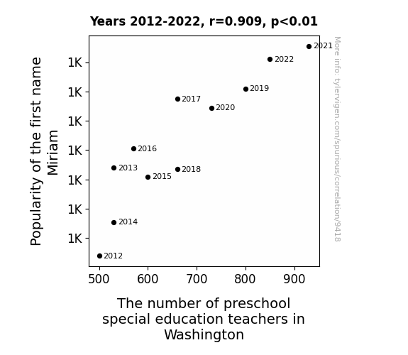 This means 82.6% of the change in the one variable (i.e., The number of preschool special education teachers in Washington) is predictable based on the change in the other (i.e., Popularity of the first name Miriam) over the 11 years from 2012 through 2022.