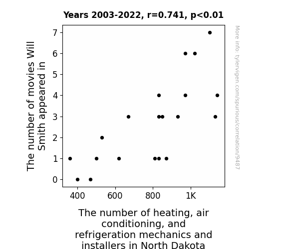 This means 54.9% of the change in the one variable (i.e., The number of heating, air conditioning, and refrigeration mechanics and installers in North Dakota) is predictable based on the change in the other (i.e., The number of movies Will Smith appeared in) over the 20 years from 2003 through 2022.
