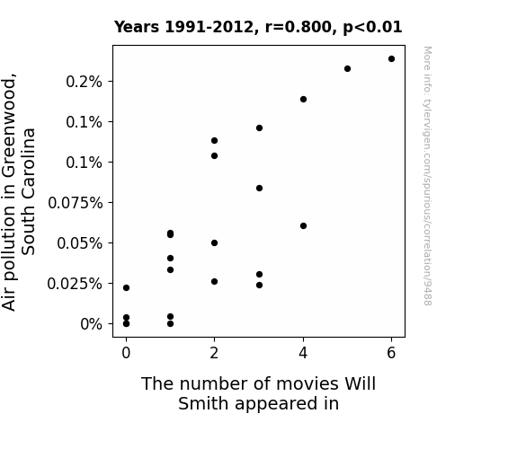 This means 64% of the change in the one variable (i.e., The number of movies Will Smith appeared in) is predictable based on the change in the other (i.e., Air pollution in Greenwood, South Carolina) over the 22 years from 1991 through 2012.