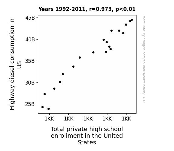 This means 94.7% of the change in the one variable (i.e., Total private high school enrollment in the United States) is predictable based on the change in the other (i.e., Highway diesel consumption in US) over the 20 years from 1992 through 2011.