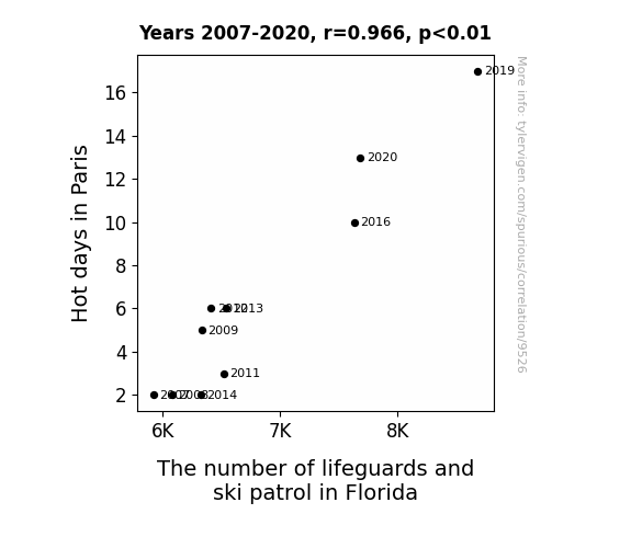 This means 93.3% of the change in the one variable (i.e., The number of lifeguards and ski patrol in Florida) is predictable based on the change in the other (i.e., Hot days in Paris) over the 10 years from 2007 through 2020.