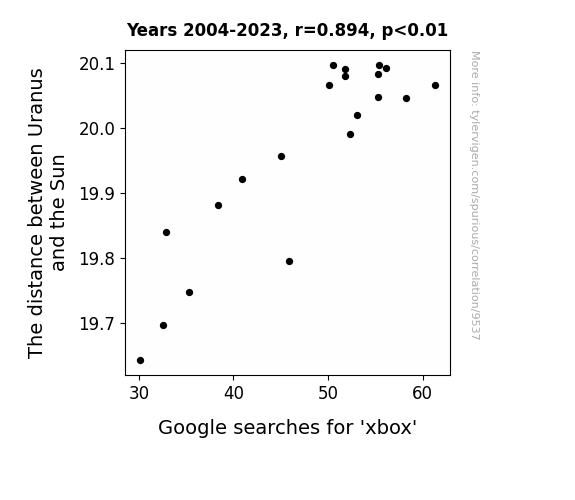 This means 80% of the change in the one variable (i.e., Google searches for 'xbox') is predictable based on the change in the other (i.e., The distance between Uranus and the Sun) over the 20 years from 2004 through 2023.