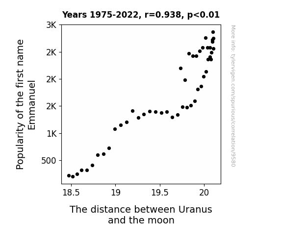 This means 87.9% of the change in the one variable (i.e., The distance between Uranus and the moon) is predictable based on the change in the other (i.e., Popularity of the first name Emmanuel) over the 48 years from 1975 through 2022.