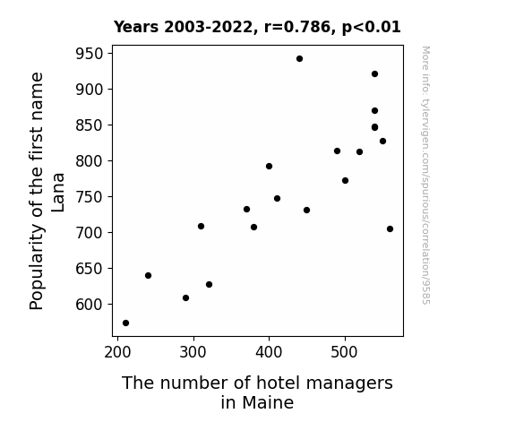 This means 61.8% of the change in the one variable (i.e., The number of hotel managers in Maine) is predictable based on the change in the other (i.e., Popularity of the first name Lana) over the 20 years from 2003 through 2022.