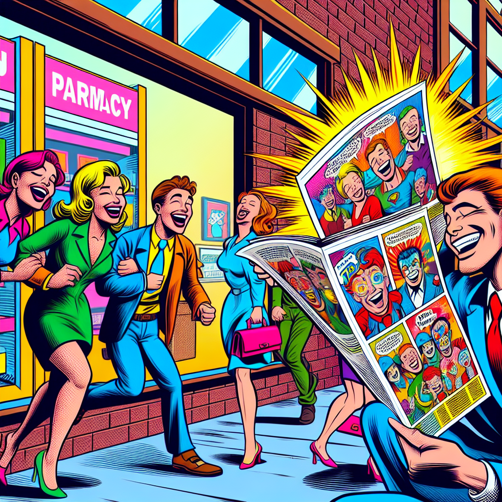 ChatGPT: Generate an image that showcases a pop art style depiction of a lively cartoon world where delightful characters are immersed in the joy of reading xkcd comics about artificial intelligence. The characters are depicted as vibrant and dynamic, bursting into laughter as they read the comics. The joyful scenes seem to emanate beyond the comic panels, reaching into the setting of a Rite Aid store. Customers are leaving the store with glowing smiles and an overall sense of contentment, evidently impacted by the cheerful atmosphere created by the AI-themed comics. The scene should evoke a sense of whimsy and happiness, with bright colors and playful, lively characters enhancing the overall visual appeal.