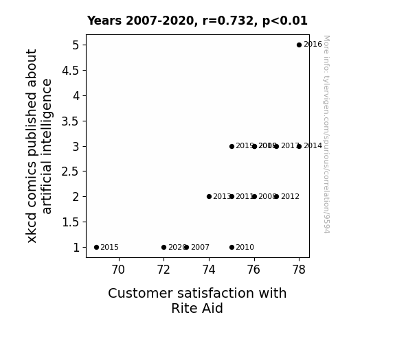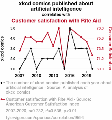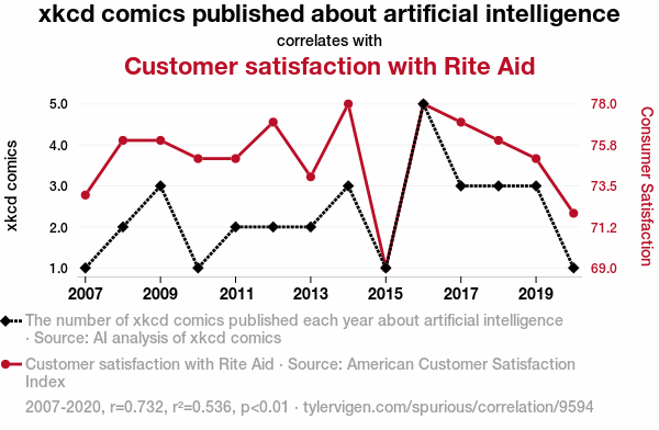 This means 53.6% of the change in the one variable (i.e., Customer satisfaction with Rite Aid) is predictable based on the change in the other (i.e., xkcd comics published about artificial intelligence) over the 14 years from 2007 through 2020.