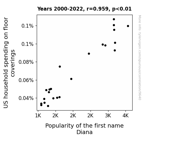 This means 91.9% of the change in the one variable (i.e., Popularity of the first name Diana) is predictable based on the change in the other (i.e., US household spending on floor coverings) over the 23 years from 2000 through 2022.