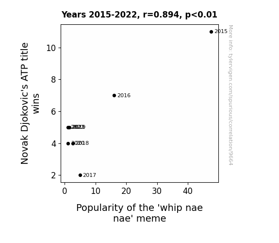 This means 80% of the change in the one variable (i.e., Popularity of the 'whip nae nae' meme) is predictable based on the change in the other (i.e., Novak Djokovic's ATP title wins) over the 8 years from 2015 through 2022.