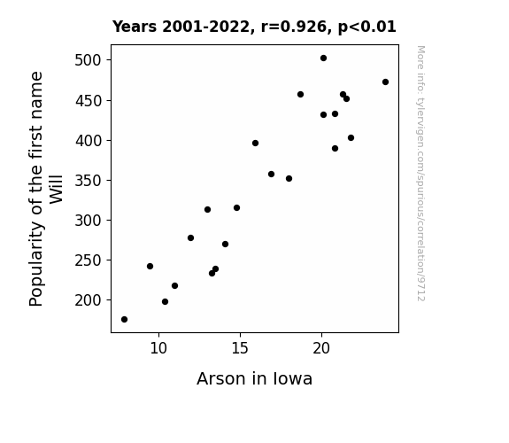 This means 85.7% of the change in the one variable (i.e., Arson in Iowa) is predictable based on the change in the other (i.e., Popularity of the first name Will) over the 22 years from 2001 through 2022.