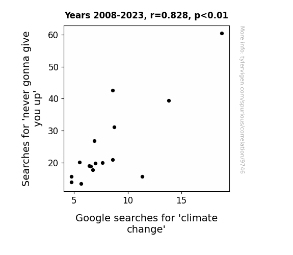 This means 68.6% of the change in the one variable (i.e., Google searches for 'climate change') is predictable based on the change in the other (i.e., Searches for 'never gonna give you up') over the 16 years from 2008 through 2023.
