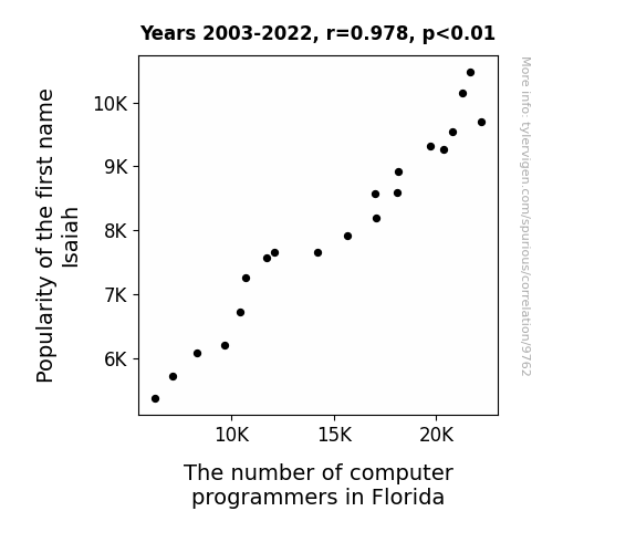 This means 95.7% of the change in the one variable (i.e., The number of computer programmers in Florida) is predictable based on the change in the other (i.e., Popularity of the first name Isaiah) over the 20 years from 2003 through 2022.