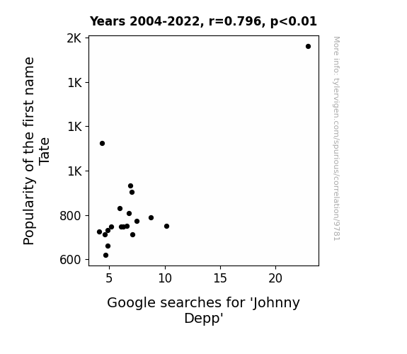 This means 63.3% of the change in the one variable (i.e., Google searches for 'Johnny Depp') is predictable based on the change in the other (i.e., Popularity of the first name Tate) over the 19 years from 2004 through 2022.