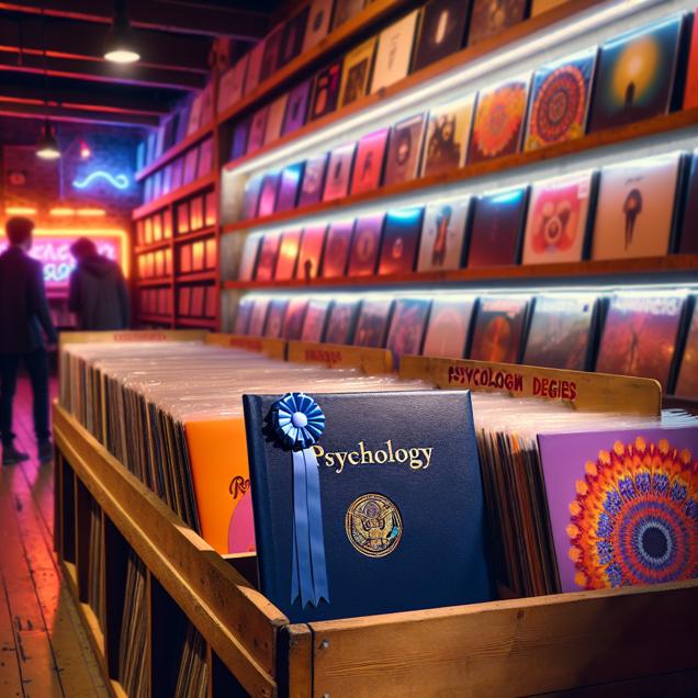 ChatGPT: Generate an image where the cozy interior of a record store is depicted with warm, inviting lighting and colorful vinyl album covers. In the foreground, a stack of Bachelor's degrees in Psychology is neatly arranged on a shelf, adorned with a calming blue ribbon. The LP/Vinyl albums on the adjacent shelf feature vibrant artwork and soothing titles, drawing customers eager to browse and find relaxation in the music. As the number of psychology degrees increases, more customers are seen exploring the store, creating an atmosphere of tranquility and connection between the search for soothing tunes and the graduates seeking solace.