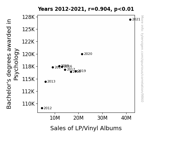 Our research team embarked on a digital treasure hunt spanning the vast expanse of the internet for data on bachelor's degrees awarded in psychology and sales of LP/vinyl albums. We scavenged through the hallowed halls of the National Center for Education Statistics and the statistical treasure troves of Statista to procure datasets covering the years 2012 to 2021. To ensure the reliability and veracity of the data, we cast a discerning eye over a range of reputable sources to capture the most comprehensive and accurate representation of our variables of interest.