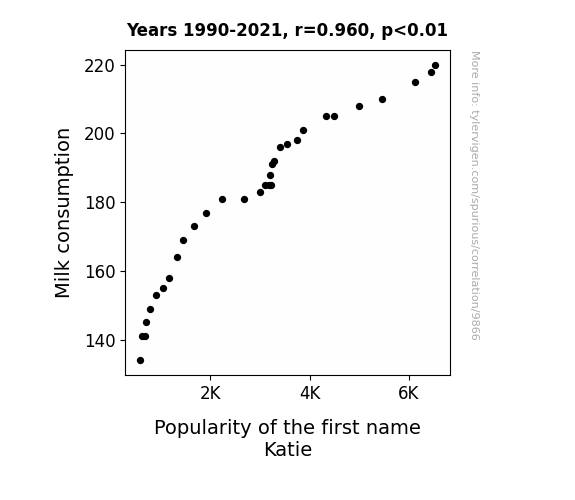 This means 92.2% of the change in the one variable (i.e., Popularity of the first name Katie) is predictable based on the change in the other (i.e., Milk consumption) over the 32 years from 1990 through 2021.