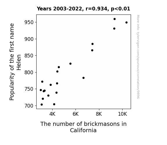 This means 87.3% of the change in the one variable (i.e., The number of brickmasons in California) is predictable based on the change in the other (i.e., Popularity of the first name Helen) over the 20 years from 2003 through 2022.