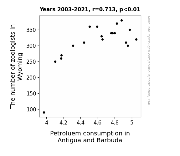 This means 50.9% of the change in the one variable (i.e., Petroluem consumption in Antigua and Barbuda) is predictable based on the change in the other (i.e., The number of zoologists in Wyoming) over the 19 years from 2003 through 2021.