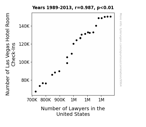 This means 97.5% of the change in the one variable (i.e., Number of Lawyers in the United States) is predictable based on the change in the other (i.e., Number of Las Vegas Hotel Room Check-Ins) over the 25 years from 1989 through 2013.